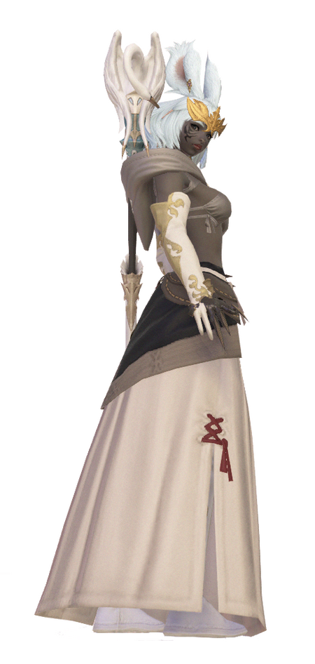 Thall was born in The Foundation of Ishgard to a runaway Viera couple who had met fleeing Dalmasca in fear of Garlean occupation. Her father, a culinarian, made money off of selling personal variations of popular Ishgardian soups and stews: fresher, more vibrant, and with no meat. Eventually recognized by a wandering son of noble blood, he had found himself as a private chef for noble families, allowing the family freeroam of The Pillars. Upon reaching Ishgard, Thall's mother quickly took an interest in machinery and spends most of her time servicing broken equipment at the Skysteel Manufactory, or tinkering with explosives in her studio.Despite overwhelming support from her parents, Thall had grown up believing she had no interests or talents (productive or otherwise) other than being able to cook a mean frittata- an accomplishment afforded to her under guidance from her father. Like many children, she had taken up occasional work under her parents- soon deciding she would much rather accidentally burn a filet than potentially lose an arm fiddling with grenades like her mother. It was in the kitchens of Ishgard that Thall had found her love of spinning stories and telling jokes.Alongside her father, Thall later ends up attending a traveling cuisine festival- part of the Eorzean Alliance's coalition efforts, aimed to showcase the beauty of food among different regions. With an empty stomach, she made quick work of every stall. One particular vendor, a Limsan named Lilitofu Nono, offered her a plate of varied dishes on the house. As she tasted each, he described flavor profiles and character notes Thall couldn't quite pick up on. He had obviously had much more time to develop such a unique and diverse palate. Quick to trust, Thall pleads with the vendor to mentor and hone her cooking skills. Soon enough, Thall is taken under Lilitofu's wing as his personal chef and bard.Who doesn't love dinner and a show?